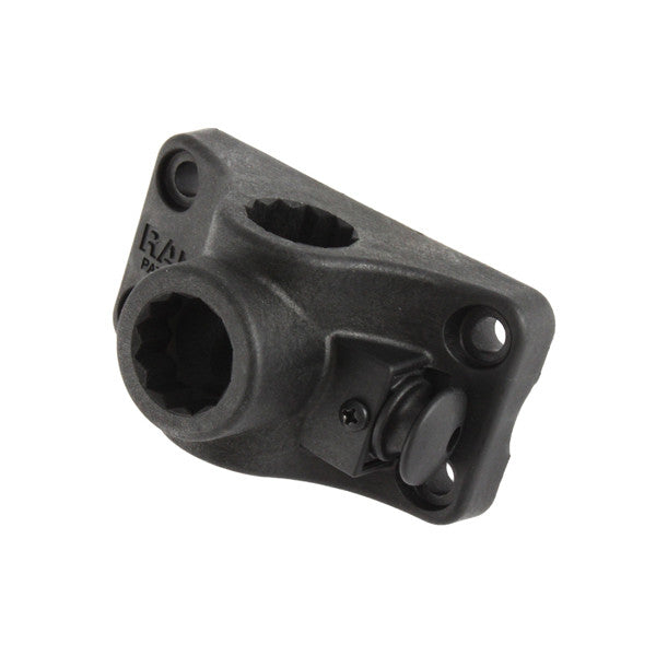 The combination bulkhead/flat surface mounting base can be installed on a flat surface such as the deck or on a vertical surface. This mounting base features a locking feature which requires the release of a plunger to remove the rod holder. Compatible with RAM post and spline rod holders and RAM wedge mount ball adapters.