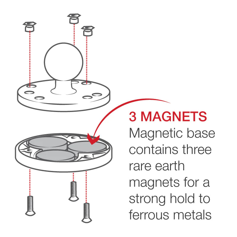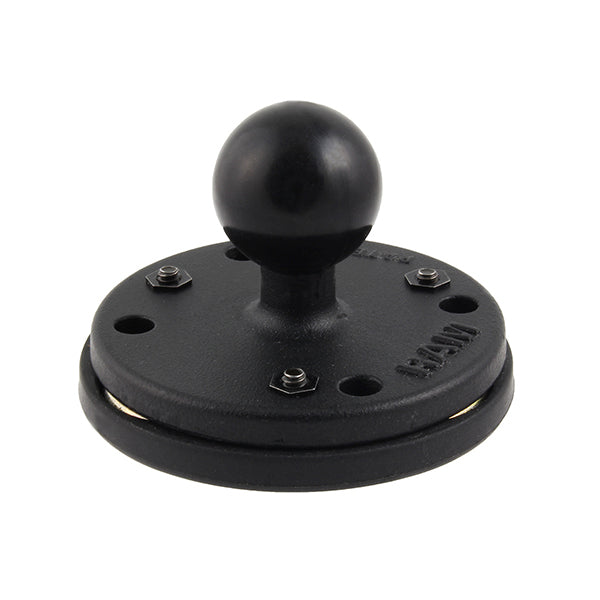 The RAM-B-202-339U consists of a 1" diameter rubber ball connected to a flat 2.5" diameter base and triple magnetic base adapter. The 2.5" diameter base contains pre-drilled holes including the universal AMPS hole pattern. The magnetic base adapter contains 3 rare earth magnets that hold firm to ferrous metals. Simply put this product near the mounting surface and feel it almost jump out of your hand. The composite adapter designed to conceal the magnets is made of durable composite to prevent scratching the mounting surface. Ideally suited for many applications you’re sure to find many ways to use your new magnetic mount at work home on the go or at play.