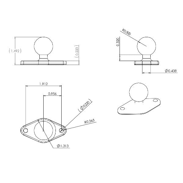 The chrome plated base contains a 1" diameter rubber ball connected at right angles to a 2.43" x 1.31" diamond base. The base has two holes 1.912" from center to center positioned at both ends of the diamond base.