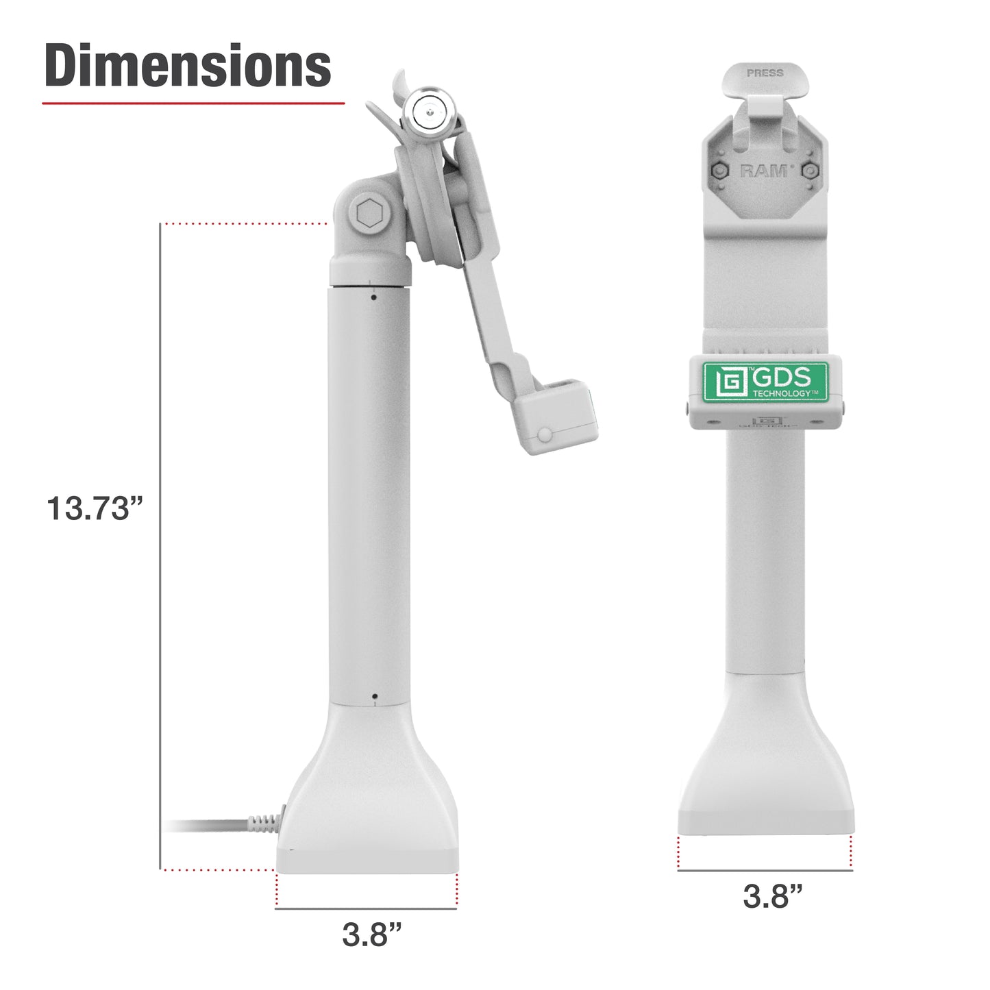 The GDS Uni-Conn 14" Locking Pedestal Dock with PoE - Gray (RAM-GDS-DOCKLR-D11-14-U1E-GRY) is a free-standing, 14" pedestal dock for devices enclosed in an IntelliSkin Next Gen, IntelliSkin Hard Case, or standard IntelliSkin Thin-Case with a GDS Uni-Conn adapter. This solution can swivel 180 degrees and allows devices to tilt 180 degrees, which is ideal for customer-centric industries like retail, hospitality, food service, and more. Keep your device safe in high-traffic environments with the key lock, integrated to provide additional theft deterrence. Power is provided to the pogo pins integrated into the GDS Uni-Conn dock via Power over Ethernet (PoE) connection. This dock features a drill-down attachment style, providing a stable base for the tall dock. The light gray aesthetic is ideal for sophisticated, bright workplaces. One Dock to Connect Them All Always Protected. Always Connected.