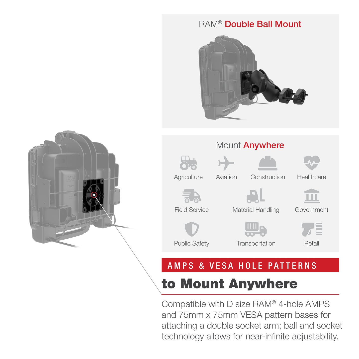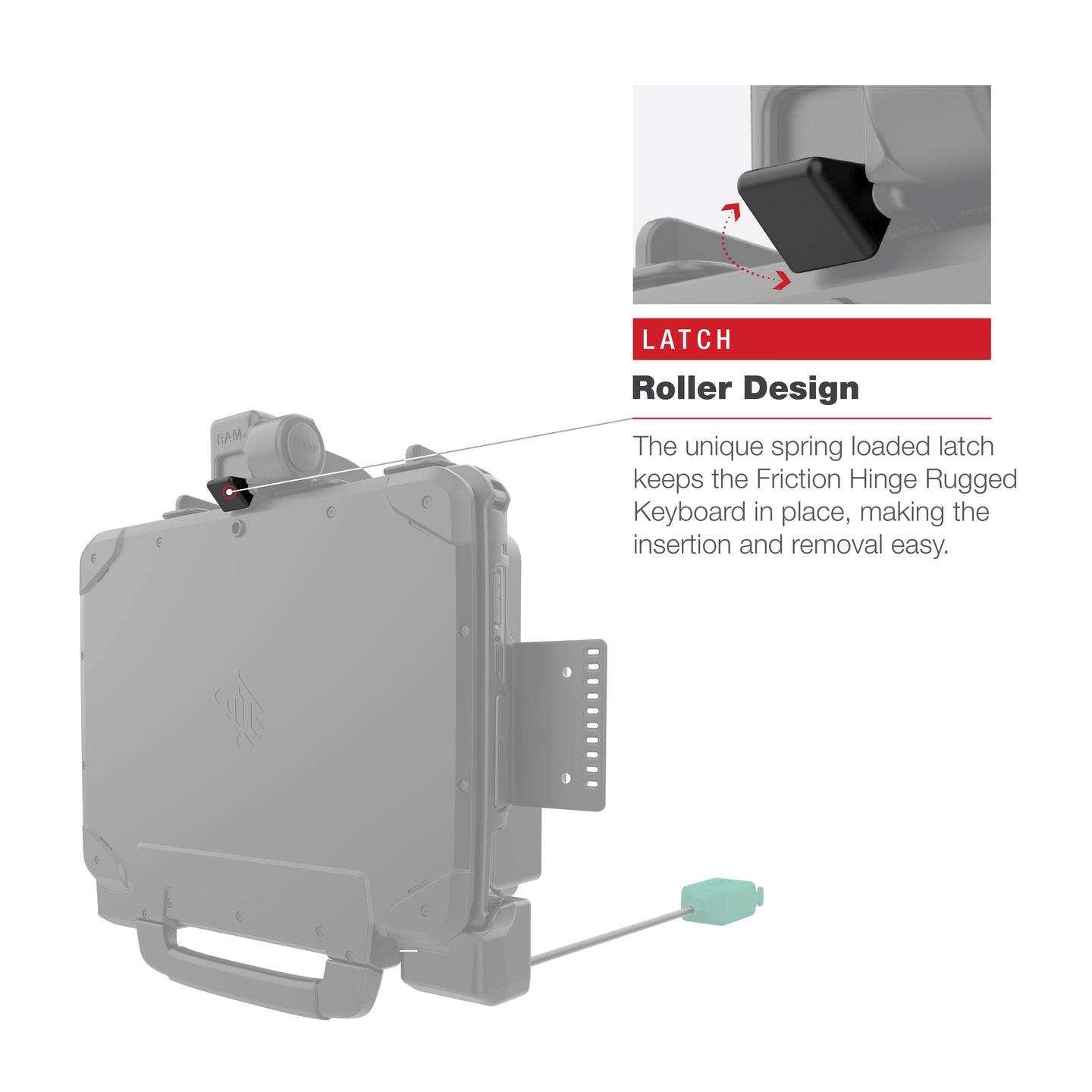 This non-locking power and dual data RAM® Dock (RAM-HOL-ZE22PD2U) features a form-fit design specifically for the Zebra ET8x tablets. Made for versatility out in the field, this dock supports the device with or without the Rugged Frame, and accommodates the optional Friction Hinge Rugged Keyboard. Connect up to two desired peripherals while keeping the device charged through the pogo pin contacts when the device is docked. Power is provided by connecting to the dock's 5.5mm DC power jack, while peripheral support is provided by the built-in dual USB Type-A cable. Thoughtfully designed, this dock also allows space for tablet add-ons such as the Zebra Expansion Back, GDS® Roto-Mag™, and GDS® Hand-Stand™ ergonomic accessories. Embrace the weather with options to upgrade your dock with temperature modules. The RAM® Temp-Right™ can be added to regulate heat in extremely cold environments while the RAM® Vent-Temp™ utilizes the vehicle's A/C vents to direct hot or cold air to the ET8x. Take the solution a step further by upgrading to an add-on NFC Repeater module that extends the device's internal NFC reader. Pair this with the docks built-in 2-hole mounting plate compatible with RAM® 2-hole diamond base for mounting the NFC Repeater, or any other additional device such as a phone, scanner, or printer.